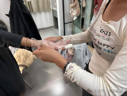10月28日晚,数媒2505班李诗倩留意到室友白天手指受伤包了纱布,特意找来防水防护手套。她一边帮室友戴手套,一边反复调整位置:“一定要戴紧,不然水会进去。”简单的动作里,藏着对室友的贴心。