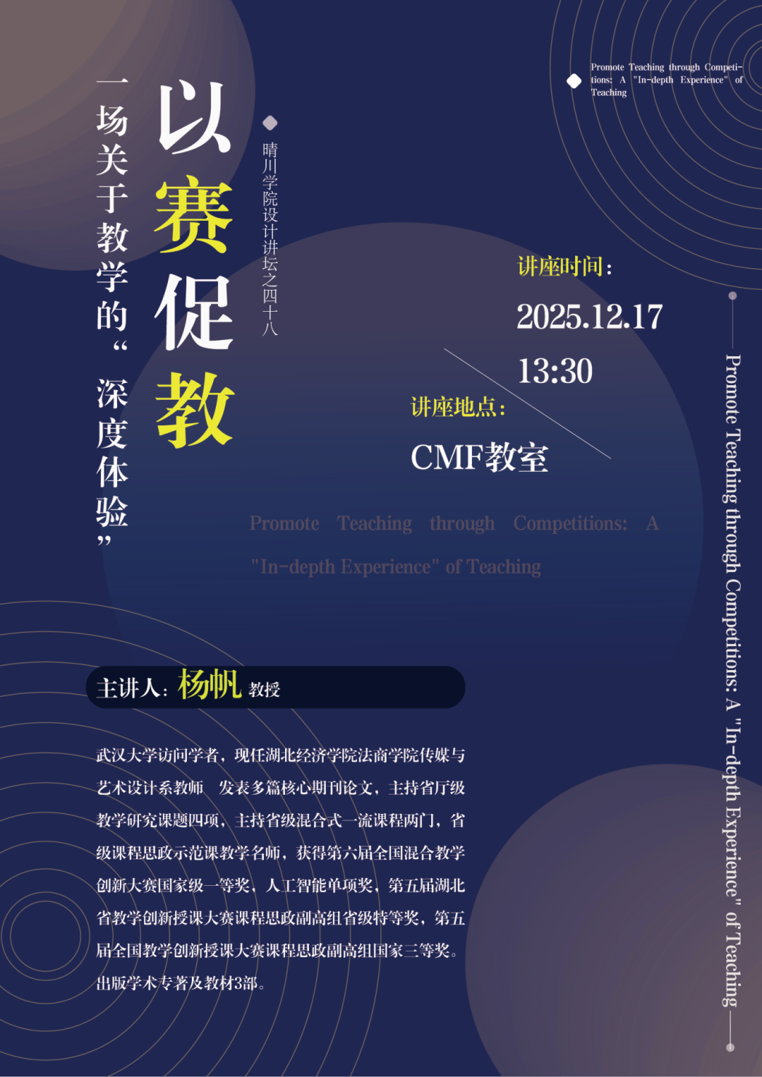 以赛促教:一场关于教学的“深度体验”主讲人: 杨帆 主讲人单位:湖北经济学院法商学院职称职务:副教授/传媒与艺术设计系主任 举办单位:武汉晴川学院设计工程学院时间:2025年12月17日 13:30地点:CMF教室