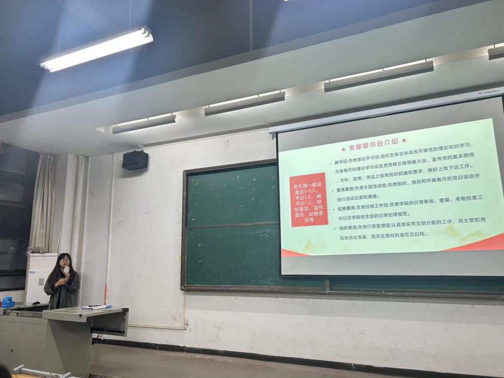 紧接着,学生党支部副书记李佳敏同志强调在积极分子期间,要遵守纪律,并重点提到支部内的纪律问题,告诉同学们要珍惜此次来之不易的机会,时时刻刻记住自己的身份,不要抱有侥幸心理;要严格约束自己,努力学习党的相关知识,树立严格的纪律观念,在思想上、行动上要积极向党组织靠拢。