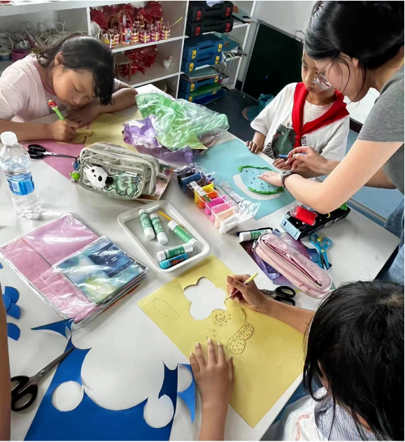 在实践与拓展环节,志愿者们都十分热情地对学生们进行指导与帮助。学生利用卡纸、画笔等物品绘画出独特的扇面图案。每个学生都有自己独特的想法与见解,最终收获了独一无二的最美的团扇。