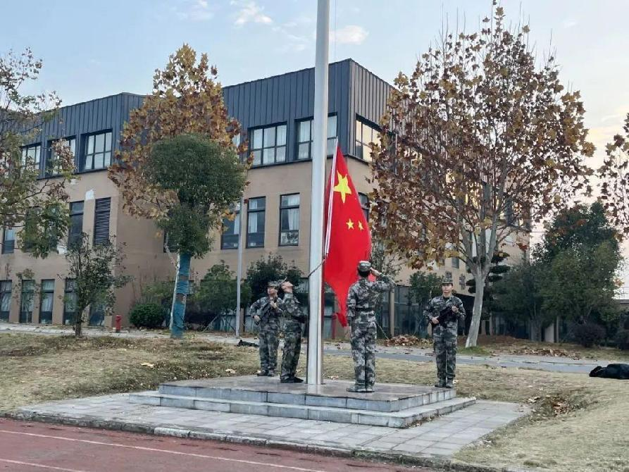 升旗仪式正式开始,全体师生面向国旗,奏唱国歌,向国旗行注目礼。嘹亮的歌声里,国旗冉冉升起,在蓝天的映衬下,五星红旗迎风飘扬。