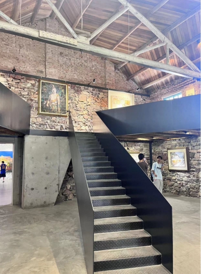 山水交汇处一面的房子像叠出的山峦,石头房子,远处的山也像是美术馆的一幅画,自然与人工平衡的刚好。与其它美术馆不同的是太行新宇美术馆更多的是与大自然的浪漫约定,在自然与艺术的灵魂碰撞下形成了建筑共生之美。“设计可持续地利用当地旧有石材,活化传统石造工艺,营造出多层次的公众开放空间”这是王冲工作室的设计理念。在资料和当地人对美术馆介绍的辅助下我们了解到石板岩—“一个藏在大山里的中国画谷”,同时它也晋升为北方最重要的写生基地,而这也正是基于乡村文旅振兴的背景,在此背景下美术馆正式建立。