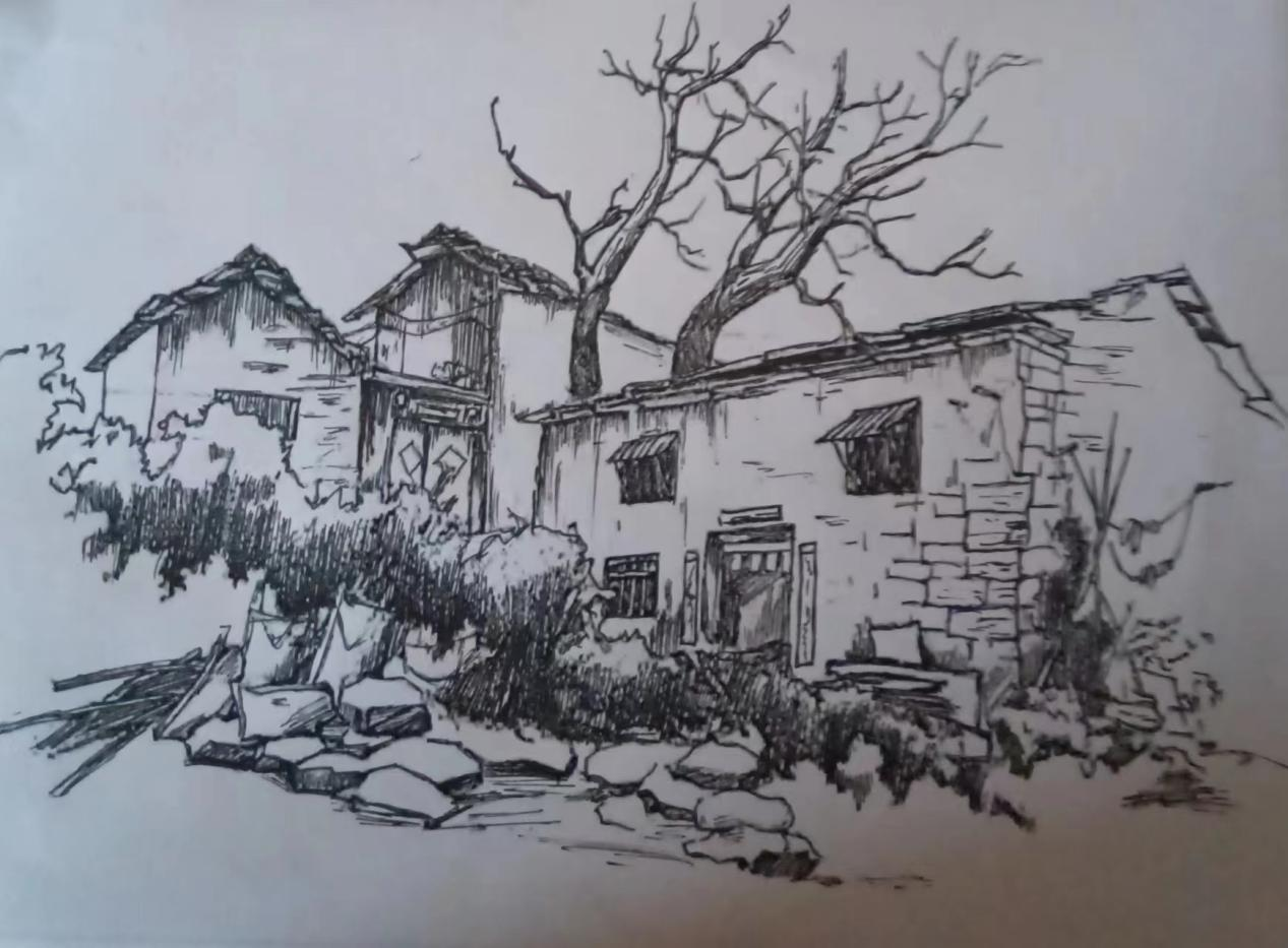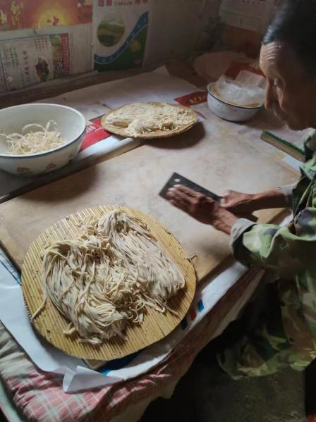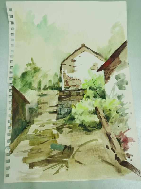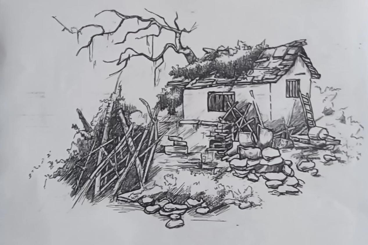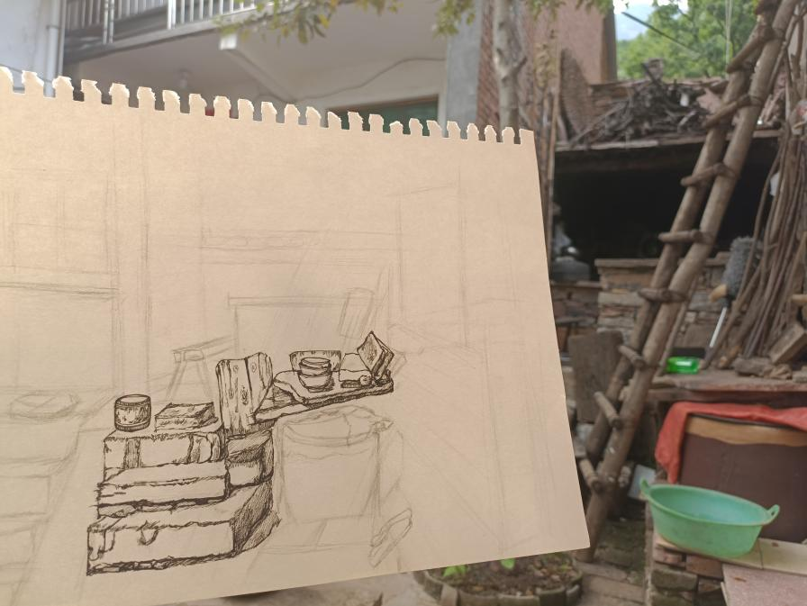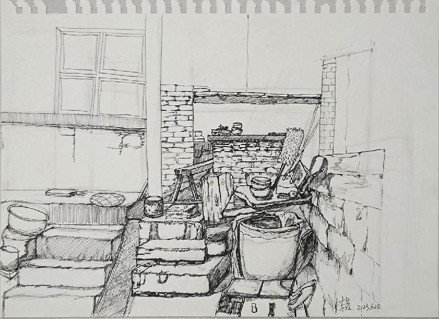 临近中午,到了饭点的时间,我们决定麻烦这里的爷爷奶奶给我们做饭吃,就是他们自己做的手擀面,想尝一尝爷爷奶奶的味道。满满的一屋子全是我们的同学,等着开饭,真的很亲切。奶奶一直再问我们够不够吃,他们忙忙碌碌一中午,自己都还没来得及吃饭呢。我说:奶奶,你们也吃吧。奶奶说:没事,你们先吃,我们还不饿。真的像极了我们刚从学校回家,爷爷奶奶看着我们吃饭的那种感觉......看着他们的身影,情不自禁的想起了自己的爷爷奶奶。看了许久,也不知道自己该用什么方式记录下来这里,就拿起了身旁的画笔和纸,坐在这里安静静的用自己的方式把这里“写下来”。