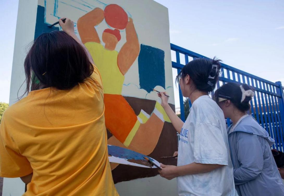 骄阳似火的盛夏,清脆悦耳的知了声,墙绘活动过程中,实践成员们热情高涨,战高温、斗酷暑,发挥自己艺术特长,以丙烯、画笔为绘画材料,精心设计。