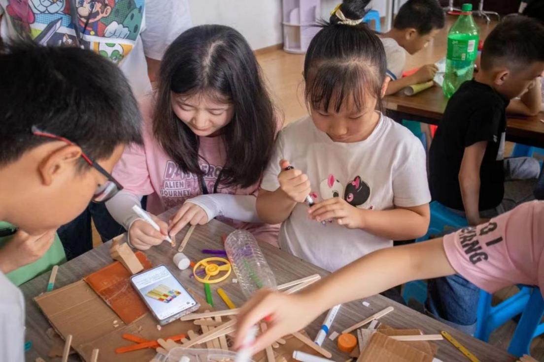 手工创作课制作的步骤较为复杂,支教老师协助小朋友们完成作业,不仅很好地辅助提升了小朋友们的手工水平,还增进了小朋友们与老师们之间的感情。言传身教,老师们通过对自己的严格要求无形中为小朋友们做出了优秀的榜样标杆。小朋友们大胆尝试,不断创新,制作出了房子、飞机、书签等作品,这些拥有梦想意义的作品,将小朋友们大胆的想象搬进现实,也让老师更能了解到小朋友的内心深处的那片梦想领域。