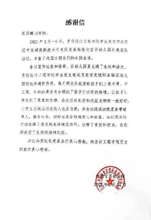 近日,设计工程学院学生党支部收到了来自东湖高新技术开发区龙泉街优优宝贝幼儿园发来的一封感谢信,信中对我院学生党支部同学们的高度评价,对他们在本学期的3月至6月为园里的孩子们上美术课、手工课表示感谢。信中提到我院党支部成员每月两次在园里上课,生动的课堂充分调动了孩子们的听课的热情,让孩子们感受到了课堂的乐趣,也受到了园里老师们的一致好评。他们用实际行动发挥了党员的先锋模范作用,诠释了责任和担当,在园里展现了良好的精神风貌。