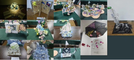 我们装置区总共十三件展品。在展区内有用破旧娃娃里的棉花绘制一方世界;有用口罩编制成温馨的蓝图;有用雨伞描绘出春天的向阳;有各种各样的奇妙想法。让旧物焕发出新的色彩,让艺术回归生活,让冷落的、破旧的、闲置的旧物在艺术的抚慰中得到舒展。