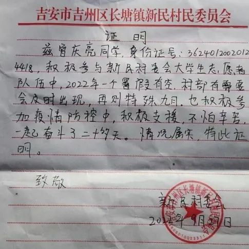 我的家乡在江西省吉安市吉州区长塘镇新民村,在假期期间,我自愿参加大学生志愿服务,积极参加疫情防控 。在假期期间,我参加了许多农村志愿者活动,例如:参与农村核酸防控工作,走访农村户厕改革,参与桔杆灭火保护环境,组织小学生农村实践活动,看望孤寡老人,宣传防溺水安全知识,外派支援卫生院和农村村委会。