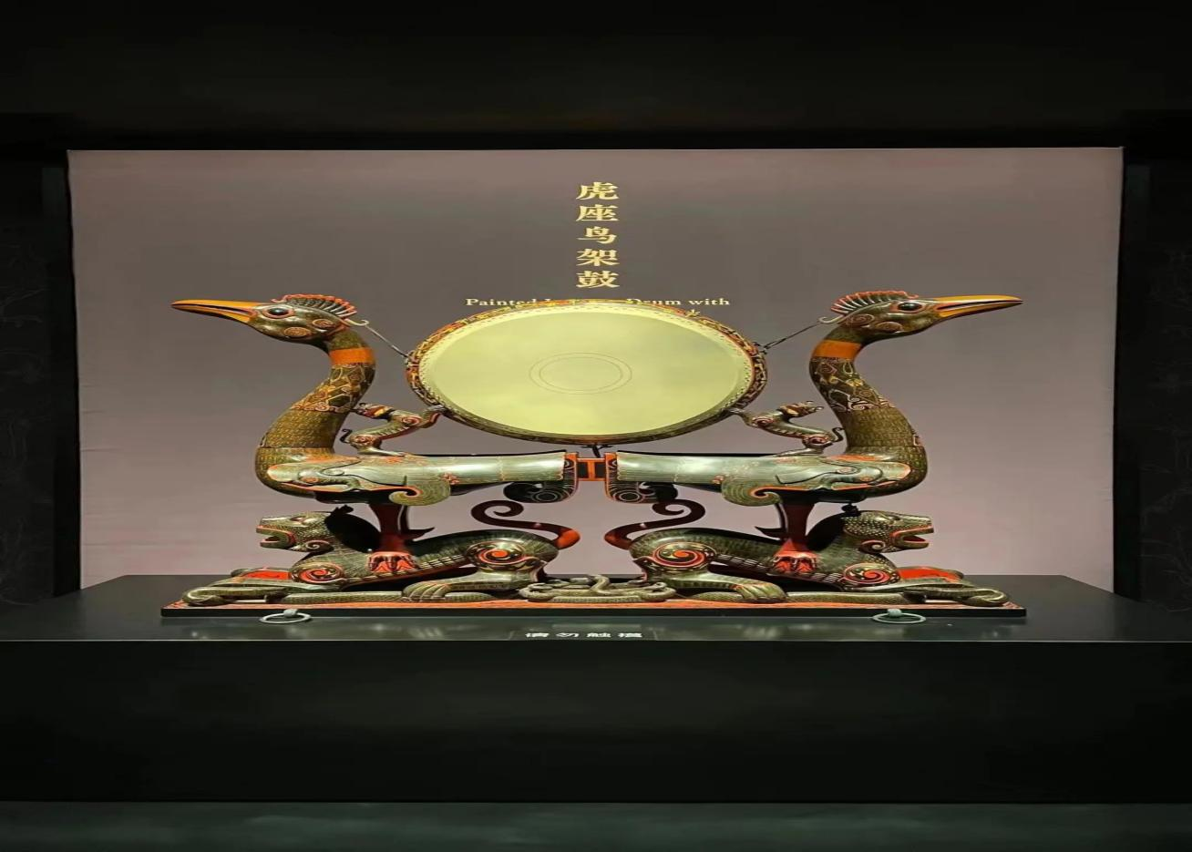 据了解,成员们得知该馆是按照南馆、北馆以及东、西两个独立展馆的格局进行总体布局。而一开始看到的那幅图所描绘的文物则位于南主馆三层的“楚国八百年”展览中。该展览分为“开疆拓土”“礼俗百业”“惊采绝艳”与“上下求索”四个单元,全面展示了楚国的历史和文化。而那件具有雄奇荆楚特色的虎座鸟架鼓,它于2002年出土于湖北枣阳九连墩楚墓2号墓,年代为战国中晚期,通体髹黑漆,饰有红、黄、银白多色彩绘,稳重的虎座与飞扬的凤架彰显了楚文化的浪漫与神奇。从虎座到凤架,从形制到彩绘,及其精美程度,都称得上楚国髹漆艺术的代表作。