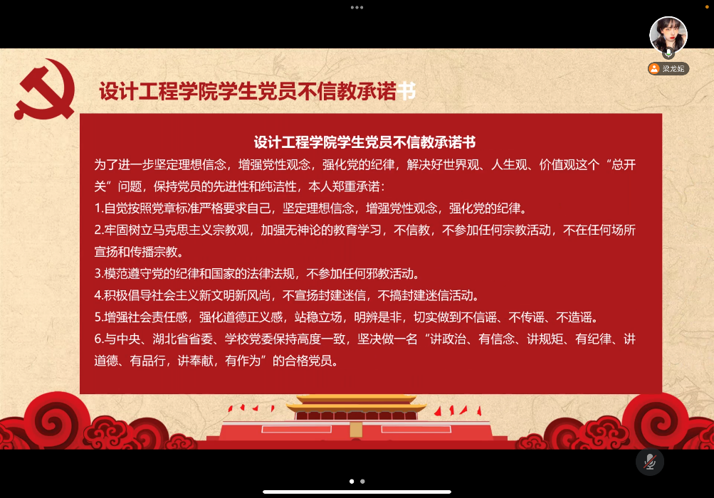会议的第三部分是为贯彻落实国家宗教事务局公布的《互联网宗教信息服务管理办法》进一步坚定理想信念,增强党的纪律,解决好世界观、人生观、价值观这个“总开关”问题,保持党员的先进性和纯洁性,参会的同志们都郑重宣读设计工程学院学生不信教承诺书。