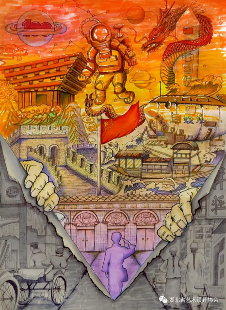 今天的湖北,早已不是那时的荆楚可比,在新民主主义革命时期,一代代仁人志士为了革命的胜利在这里奋斗,形成了湖北独特的红色文化,这片红色的沃土同时也将荆楚文化的精神绵延千古至今:“筚路蓝缕”的进取精神、“抚夷属夏”的开放气度,“一鸣惊人”的创新精神、“深固难徙”的爱国情结和“和众安民”的和谐理念。地处中原的湖北以其独特的地理环境孕育了丰富的红色文化资源,而勤劳朴实的湖北人民则不断将红色文化发扬光大。本次大赛以建党百年为背景,以红色为主题,既展现了我院设计学子的专业特色,还带动每一位同学知党、爱党、兴党。