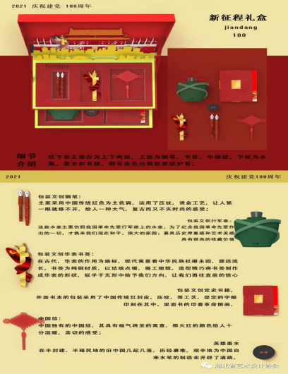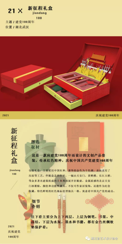 湖北是一片红色的沃土,历史悠久,文化发达,中华始祖炎帝就诞生在湖北,荆楚文化根基深厚,特色鲜明。这次红色文化艺术设计大赛的作品,是设院学子为庆祝我党100周年华诞送上的珍贵礼物,也是同学们表达对中国共产党的热爱与祝福的媒介,更是我院学生专业课程学习理论与实践相结合的一次全新探索。以下是我校在此次大赛中获奖作品的展示。