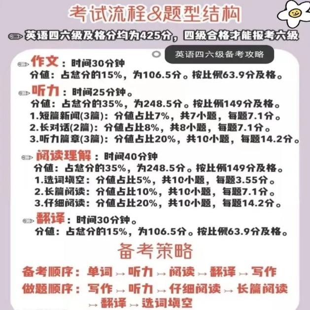 备考前先了解一下四六级的考试流程和题型,根据相应题型进行复习和强化。这点可以通过浏览往年真题了解。