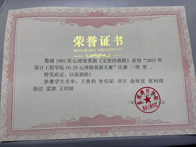 各学院的16组入围校内决赛队伍经决赛现场考核,最终遴选出校内二强参与湖北省心理短视频竞赛。我们设计工程学院入围校内决赛的是由数媒1902 王鲁豹、数媒1902刘宇、数媒1902张珂琪、数媒1901杜伯韬、数媒1902 俞欣宜、数媒2001 王绍妍、数媒1902雷津、数媒1902王艺璇、数媒1902王志杰、数媒1902 王诗怡、数媒2001 康小燕同学组成的队伍,最后荣获校赛二等奖。