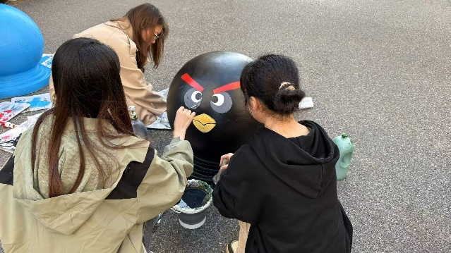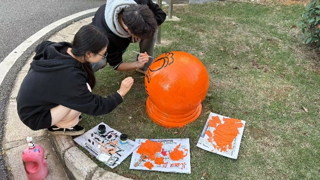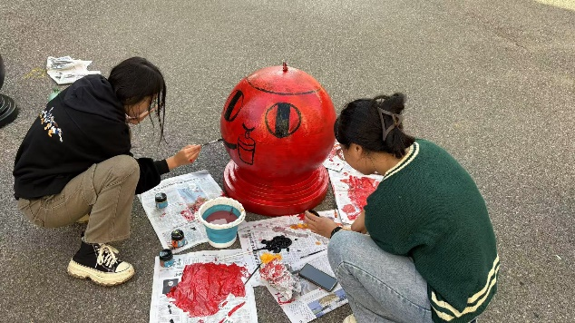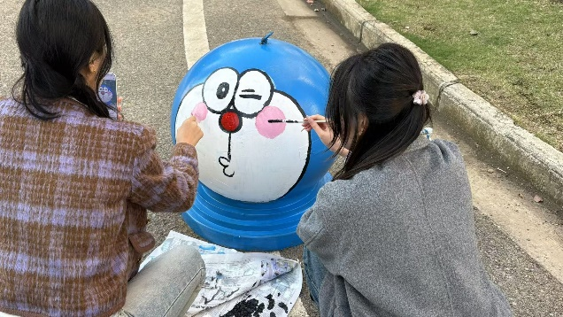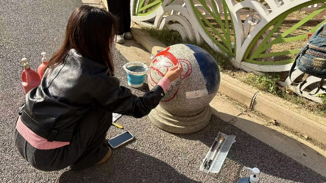 设计工程学院志愿者分工明确,有条不紊地进行着各项准备工作。有的精心调色,有的专注绘画,每一笔都饱含着对校社共建——共同缔造的欢喜和对志愿活动的执着。在绘画过程中,志愿者们充分发挥自己的专业特长和创意才能,用画笔勾勒出一幅幅生动有趣、富有活力的图案。有可爱的卡通形象、美丽的花朵、温馨的标语等,这些作品不仅为石墩增添了亮丽的色彩,更传递出积极向上的正能量。