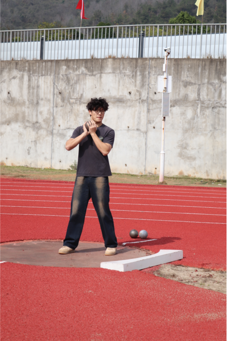而在铅球比赛中,王俊晖同学展现出了强大的力量,她用力一掷,铅球如炮弹般飞出,在沙坑中留下了深深的印记,他以全校第三的优异成绩为学院在田赛项目上增添了一抹亮丽的色彩。