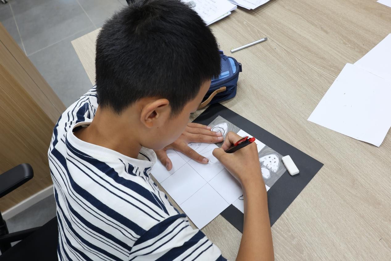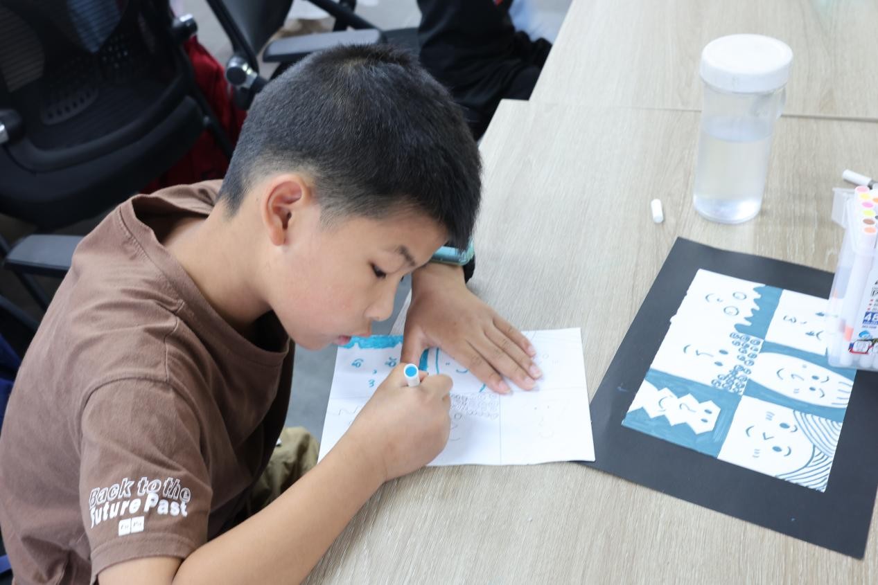 与此同时,锦园班的平面构成课正如火如荼地展开。队员们将黑白卡纸裁剪成大小不一的点、长短各异的线、形状不同的面,铺满整个桌面。随着团队成员的耐心讲解,孩子们拿起彩笔,开始了自己的艺术创作。有的将黑色圆点排列成闪烁的星空,有的用白色线条勾勒出蜿蜒的河流,还有的把不同形状的面拼贴成抽象的动物形象。小小的活动室里,创意的火花不断迸发。