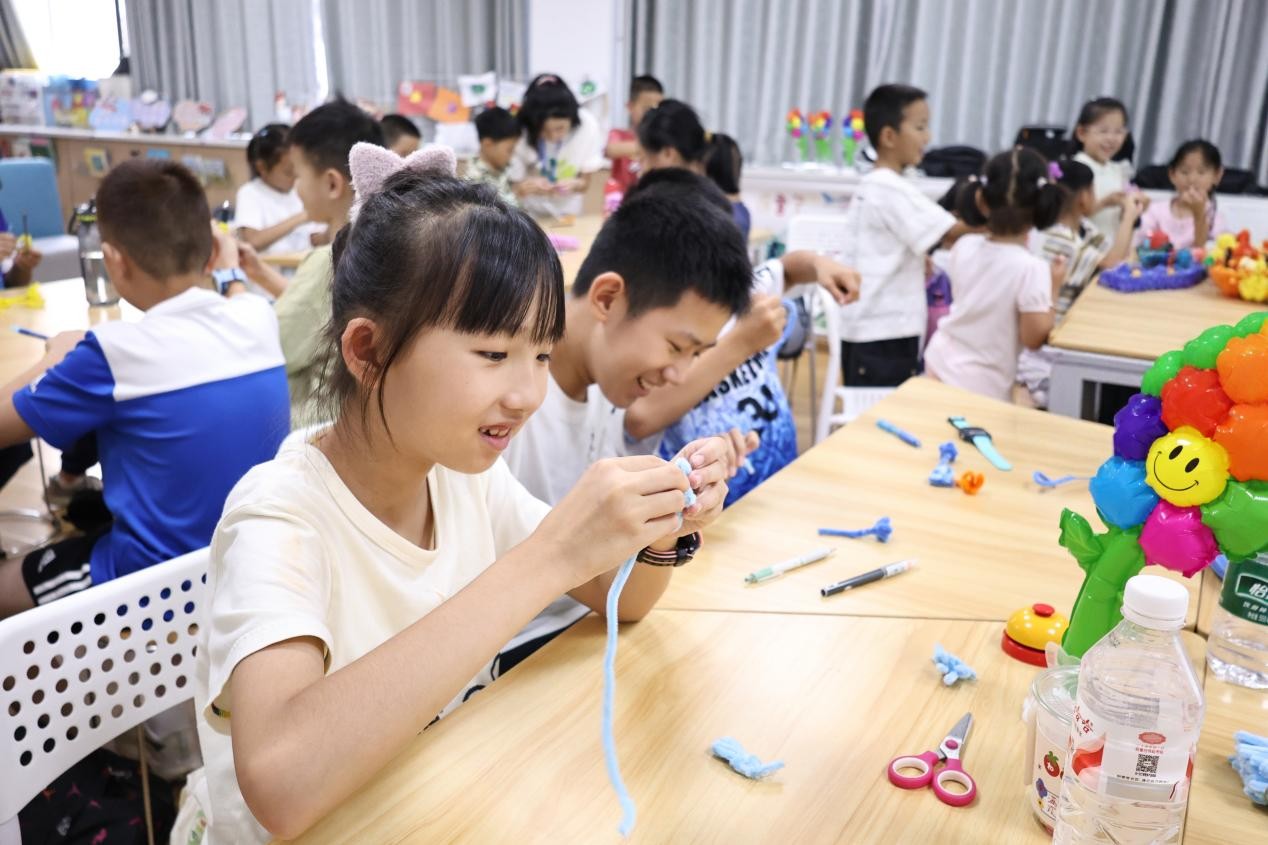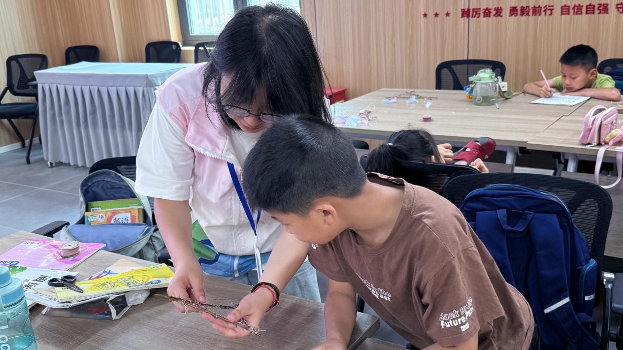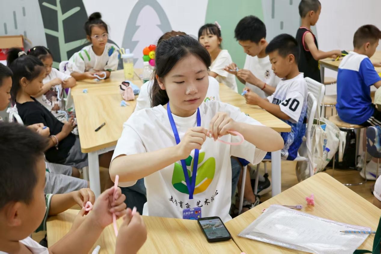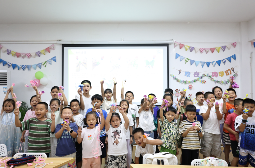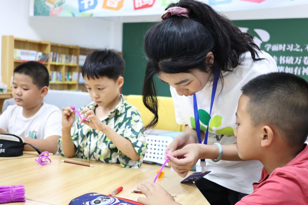 午后,团队成员们迅速投入到与孩子们的互动教学中。首场教学以“创意手工课——花团锦簇”开展,以扭扭棒作为课程材料,孩子们充分发挥想象力,将色彩缤纷的扭扭棒塑造成花朵、五角星、蝴蝶等充满童趣的作品,不仅锻炼了他们的动手能力,更让美的创造在指尖流淌,现场充满了欢声笑语与成就感。