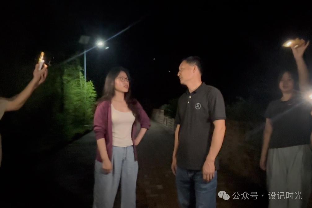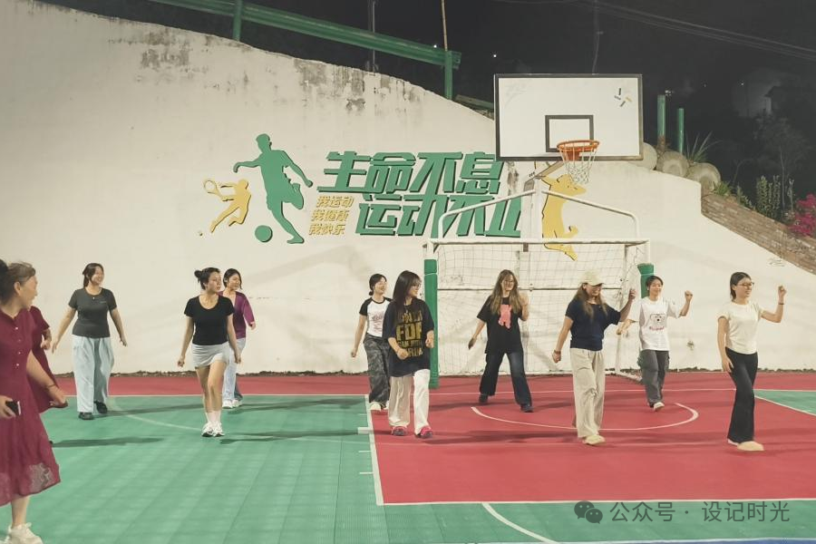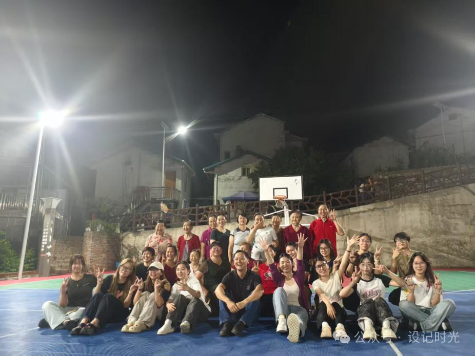傍晚吃完饭,团队成员在黄明书记带领下,来到了当地广场。路灯下的广场已聚满纳凉的村民。大家踩着石板路深入其中,眼前是一幅动态的乡村生活画卷:村民们摇着蒲扇坐在石阶上围观,篮球场上大爷和少年们在切磋球技,小广场上活力满满的阿姨们在列队跳着广场舞,小朋友们则满地追逐嬉戏......团队成员分散融入人群:摄影组和设计组捕捉篮球场上的激烈对抗、阿姨们的舞姿和村民们幸福的笑脸,文案组与小朋友们打成一片,最后团队所有成员和广场舞阿姨们一起载歌载舞。