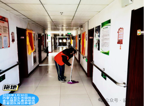 饭后拿起拖把走进长长的走廊,原以为拖地只是简单的体力活,可蹲下身清理墙角的污渍时,才想起这里的老人们大多行动不便,干净平整的地面能让他们散步时少些顾虑。于是放慢速度,顺着走廊一点点反复擦拭,不放过任何一个角落。护工阿姨走过来看见,笑着说:“地面这么亮堂,老人们散步、推轮椅都放心多啦,你们有心了。”那一刻突然懂得,敬老从来不是轰轰烈烈的大事,而是藏在这些微小的细心与坚持里,每一次弯腰擦拭,都是在为老人们的安全保驾护航。